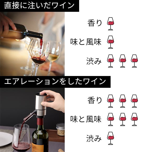 直接にガラスに注いだワインと比べて、エアレーションをしたワインのほうが香りが濃く、渋みが少なく、味と風味がおいしいというメリットがあります。