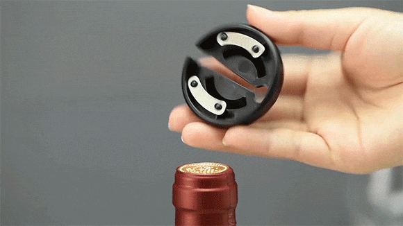 ステップ①:付属のホイルカッターをワインボトルにセットし、力を入れて回転させると、キャップシールが剥がれます。