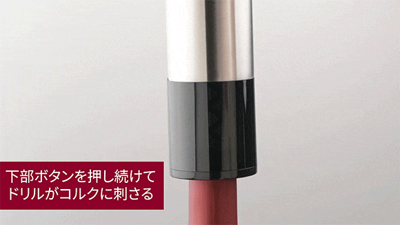 ステップ②:ドリルがコルクの中央に刺さるようにセットし、ワインオープナーをワインボトルに押し付けながら、下部ボタンを押し続けます。
