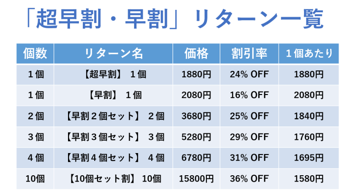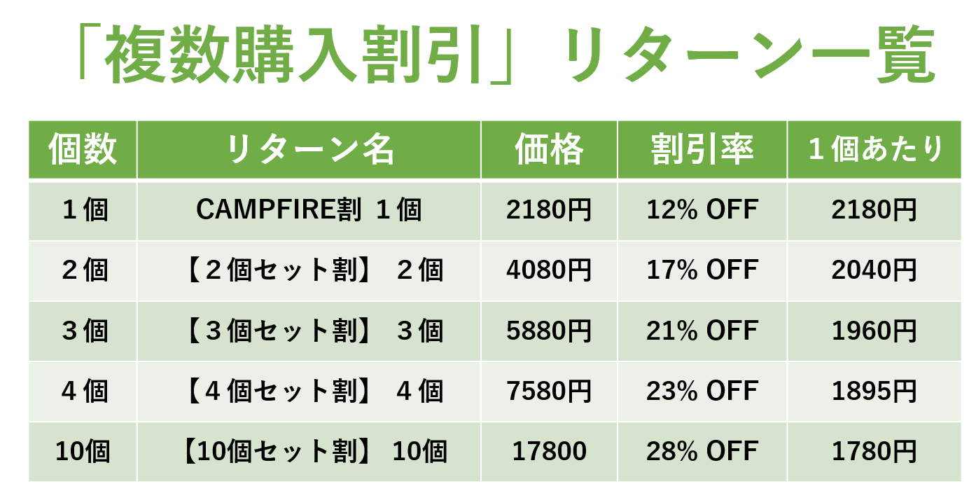 1個のみのリターンの価格はどうしても送料のウエイトが大きくなってしまいます。2個以上のリターンの方が割引率が高くおすすめです!