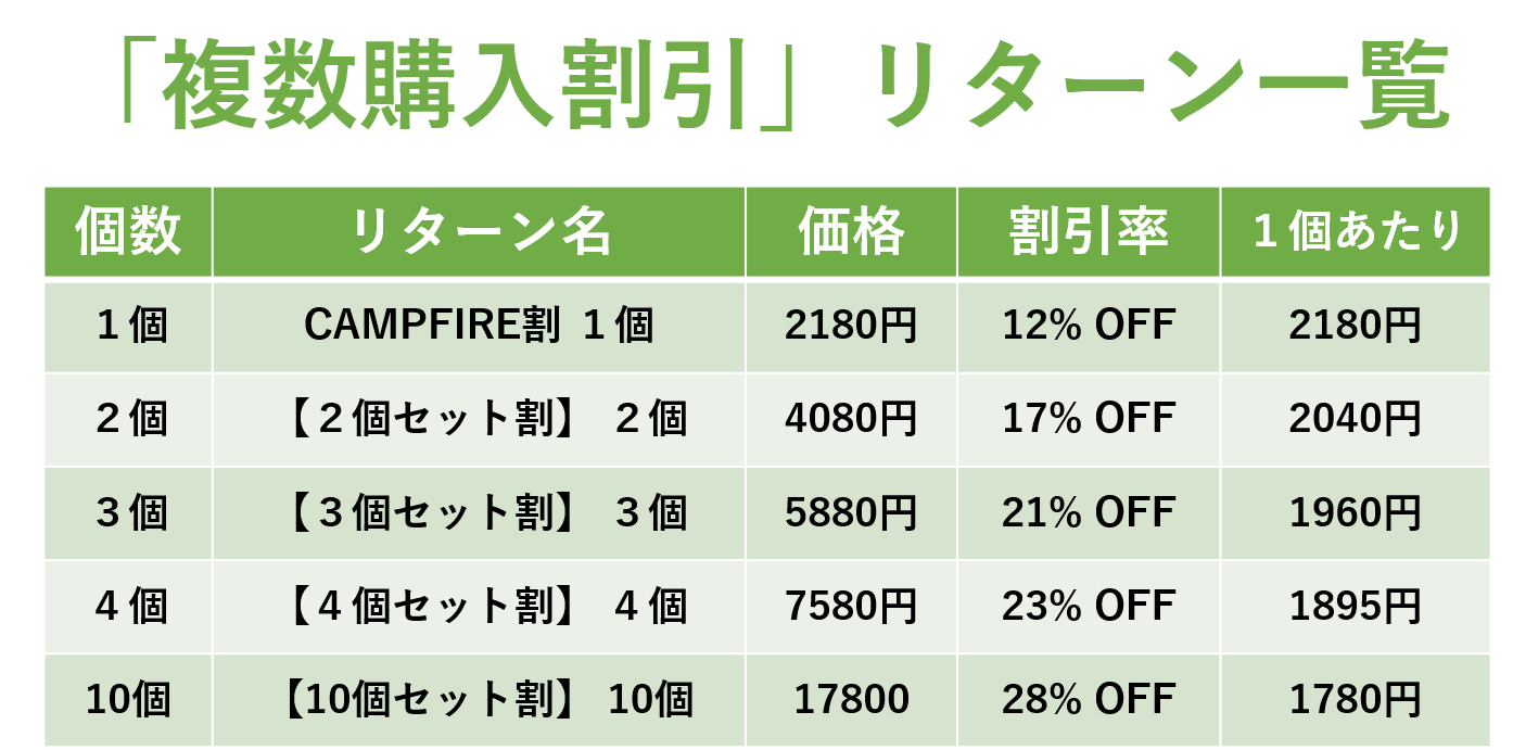 1個のみのリターンの価格はどうしても送料のウエイトが大きくなってしまいます。2個以上のリターンの方が割引率が高くおすすめです!