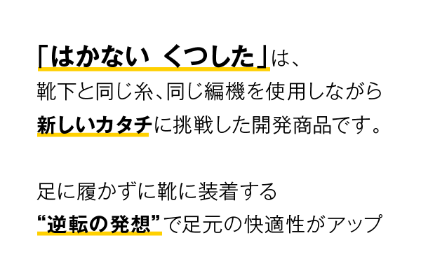 創業100年を迎え、企業メッセージとして掲げた「素足以上に足どり軽く」を実現できるように着用された方の悩み解消・はき心地の追求・健康をテーマとして新たな商品開発に日々取り組んでおります。