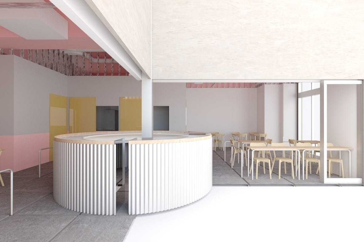 【喫茶/スペース七番】は、錦二丁目地区に新しくできた再開発施設「オリマチ錦」の足元で開業する喫茶、広場(会所、と呼びます)、路地が一体となった施設です。江戸時代の城下町にたくさんあったコミュニティスペース「会所」になぞらえ、街区の真ん中に小さな広場を設けた空間になっています。