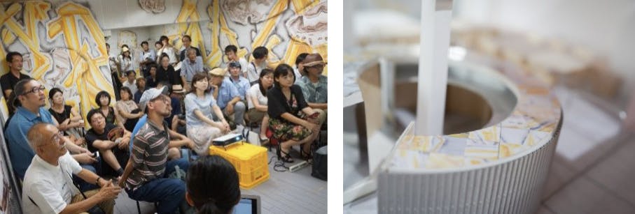 喫茶七番と会所の外と中をつなぐ象徴的な円形カウンターの天板に、このまちにかつてあったフレスコ画を再利用します。再開発施設ができる前にあった古いビルで運営されていたアートラボあいちの壁面には、まちの断片を表現したフレスコ画「ノーサイド」(川田知志)が滞在制作されていました。