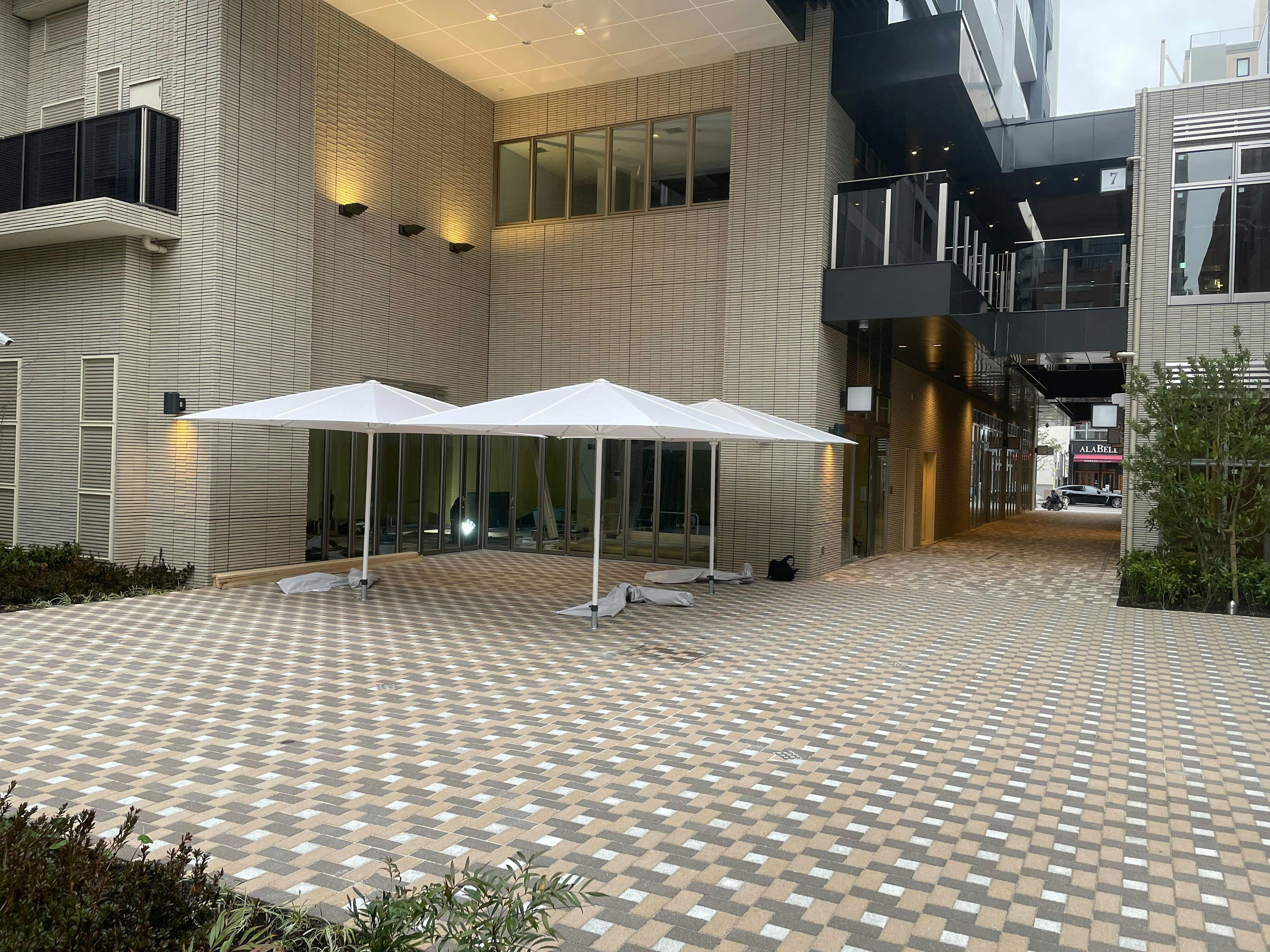 会所には、普段のテラス席利用が快適にできるよう、大型のパラソルを設置する予定です。このパラソルは、他にも場所の移動が可能、イベント時のテント代わりにも使用できます。会所がより多くの方に愛されるように、様々な天候に対応した設えを行います。