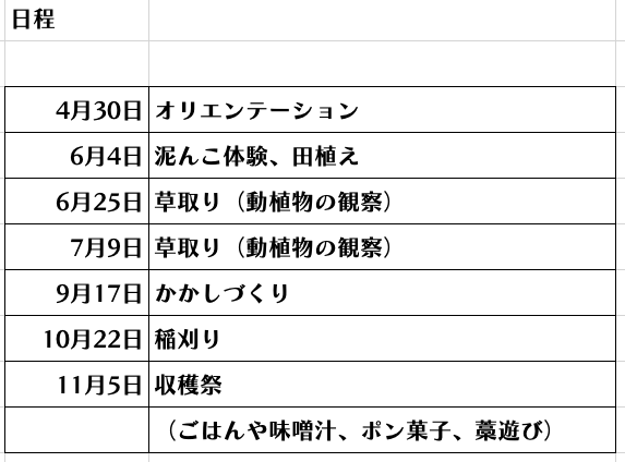 「みんなで未来をつくろ米!」プロジェクトは、下記のスケジュールでお米のイベントを計画しています。(それ以外の平日は、ぽかぽかワークスのメンバーで管理をします。勿論、支援者の皆様は、空き時間に農作業をして頂いても構いません。)