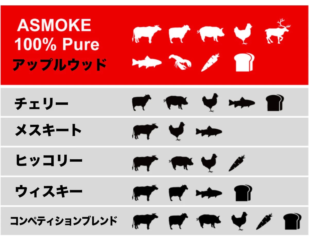 アップルウッドはどんな食材にでも合います。素材を引き立てるフルーティーな風味が、牛肉、ラム肉、鶏肉、豚肉、魚介類、野菜、ジビエ肉など、 シンプルに焼いただけで、ワンランク上の美味しさを提供してくれます。余計な調味料はもう必要ありません。