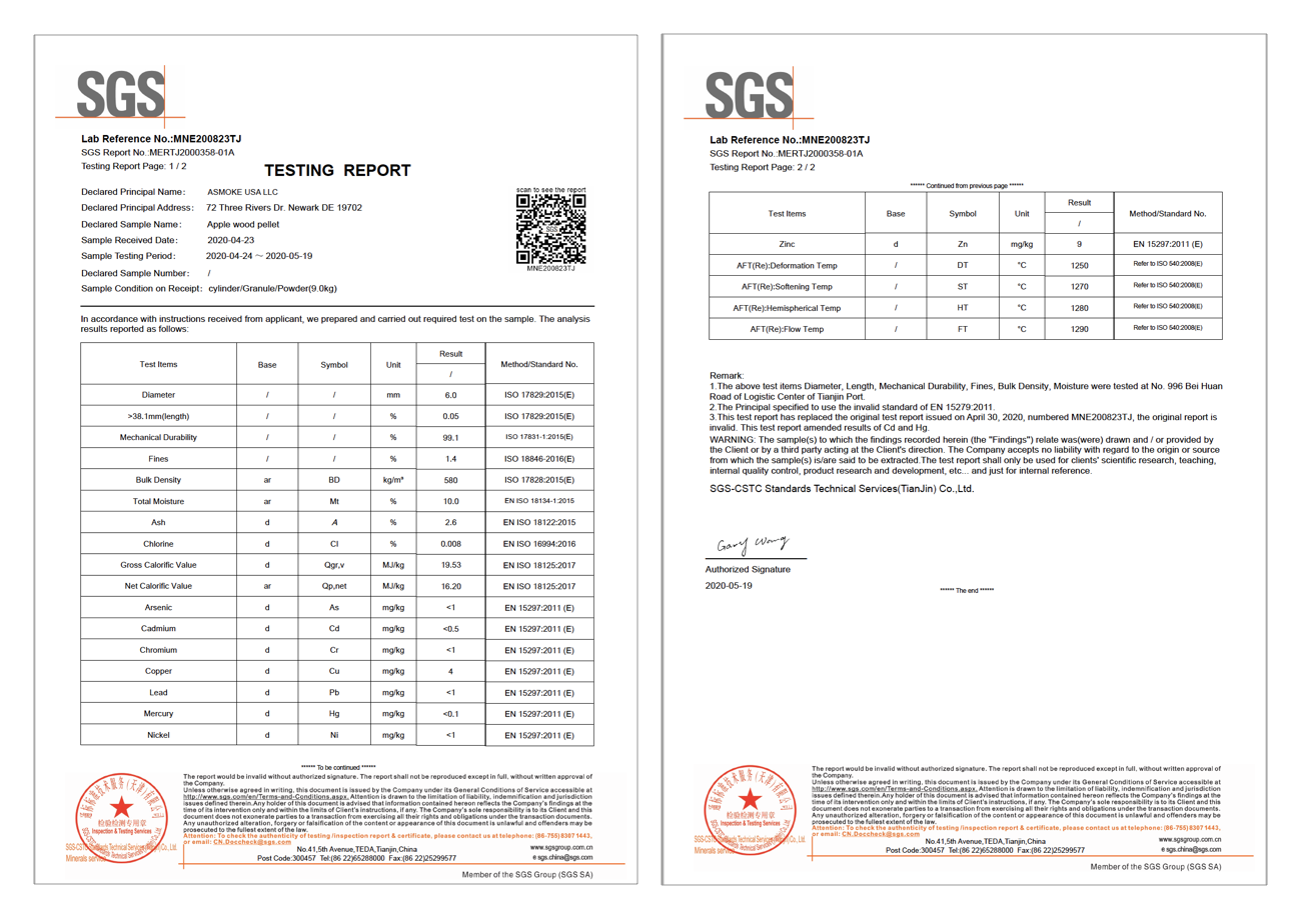 ASMOKEのアップルウッドペレットは、SGSの承認証明書により、品質検査が行われていることが保証されています。