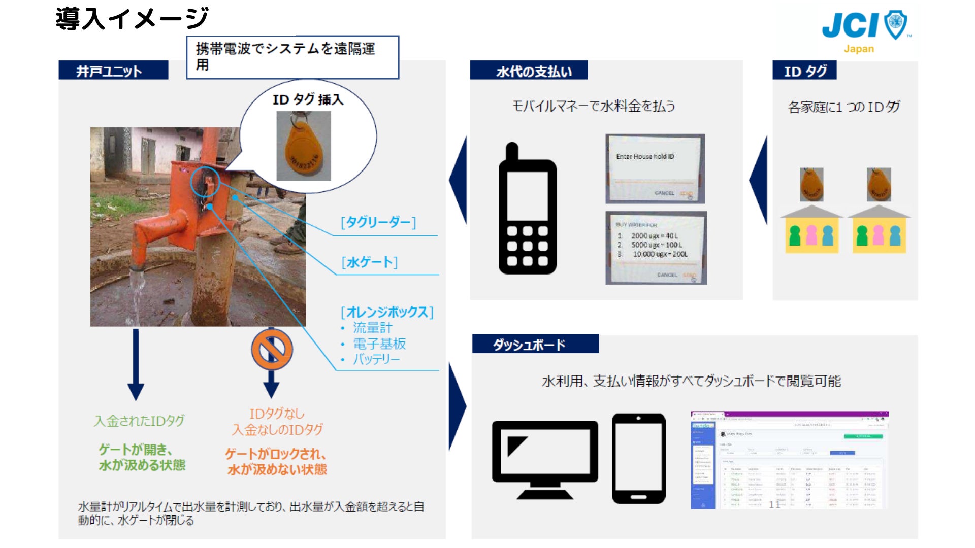 「継続的な水料金回収とそれによる継続的な井戸の稼働を実現するための、「従量課金型」「モバイルマネー」を用いた「自動」井戸料金回収のシステムです。
