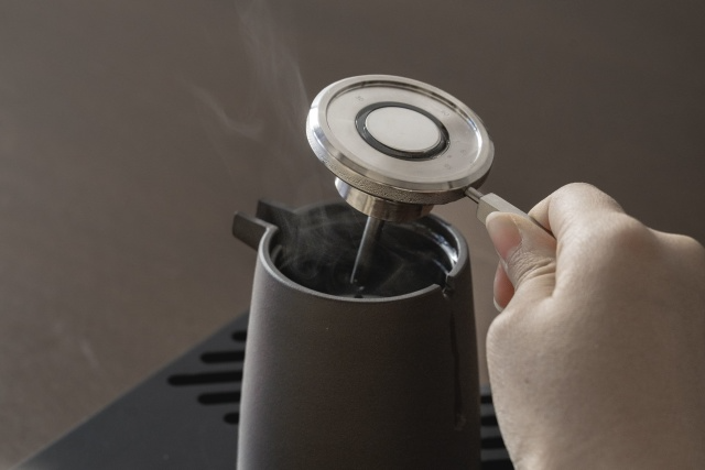 測温計をセットし、測温計表面を確認しながら、使用する茶葉に適した温度に下がるまで待ちます。