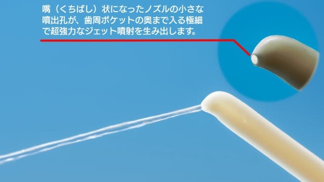 そのためジェット噴射が生み出す水流が非常に細く、歯周ポケットに直接当てればジェット噴射の勢いがダイレクトに届きます。