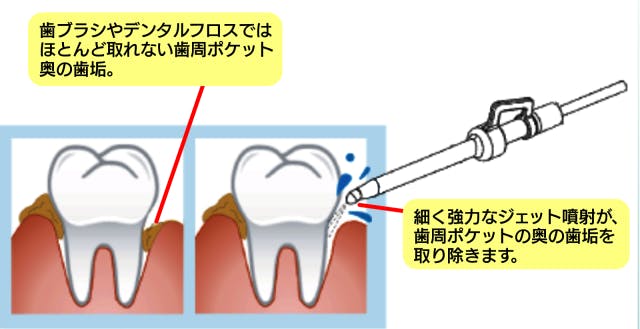 どんなに強力なジェット噴射を生んでも、狭い歯間や歯周ポケットに水が当たらなければ奥に詰まった歯垢は取り除けません。
