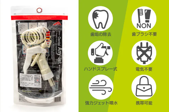 また歯ブラシも歯磨き粉も使わず、水だけで歯の汚れや歯垢をお掃除できるANYJET トゥースウォッシャーは緊急災害時のお口のケアにもおすすめ。キャンプや登山など、歯磨き粉で自然を汚したくないアウトドアでも大活躍してくれます。