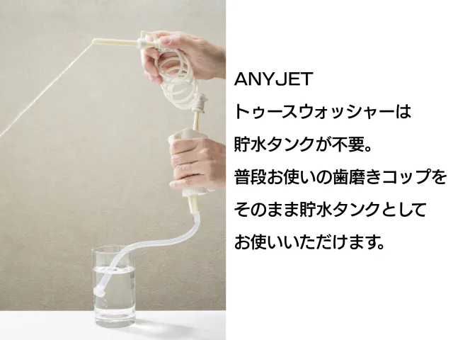 ANYJET トゥースウォッシャーはコップの水にホースを突っ込むだけで使えるので、巷にある口腔洗浄器のように貯水タンクが不要です。