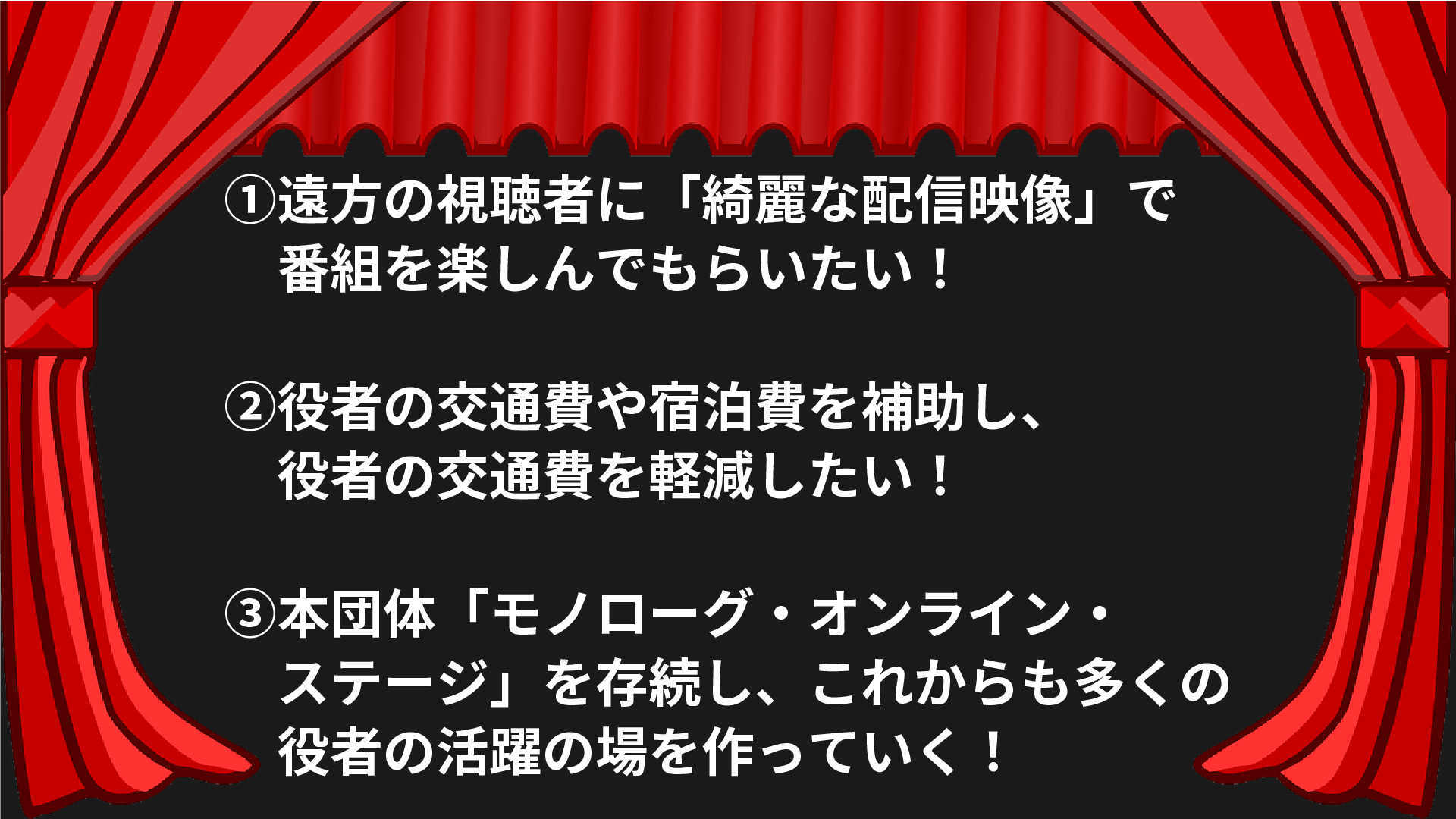 本ページをご覧くださり誠にありがとうございます。私たちは俳優の活動の場を広げるために「モノローグ・オンライン・ステージ」という団体を運営しています。