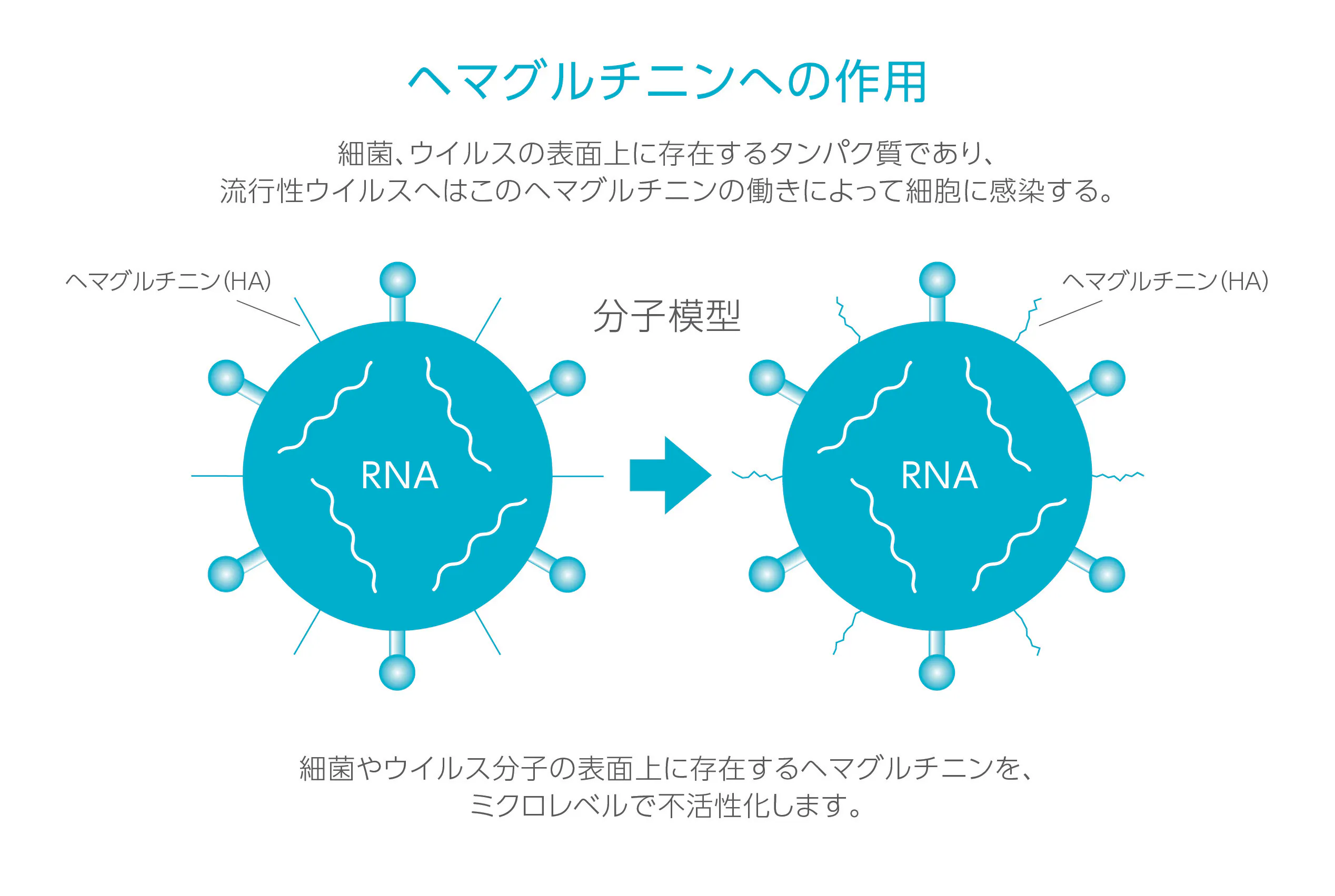 自然由来の有効成分をナノレベルまで微細化し、細菌やウイルスに素早く吸着させて、細胞の表面タンパクを変性劣化させることで効果的に死滅させます。