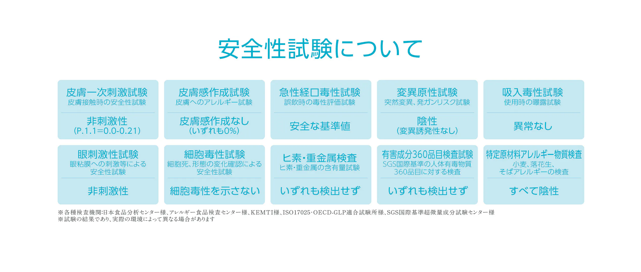 但し、上記内容は、試験を行ったという内容であり、その内容を各検査機関様が保証するものではありません。