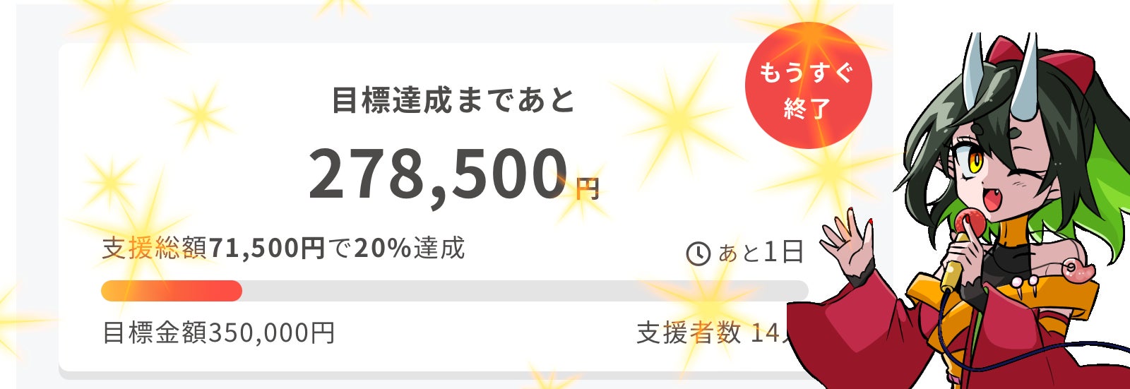 2022/05/19 07:13みんなおはもりょ!!!!今日で、魍魎丸のプロジェクトは残り1日…!!!!なんと、20%突破であります!!!!ご支援してくれた方、本当にありがとう!!!!順風満帆とは言えないけれど、それでも着実に進んでいるこのプロジェクト…本当に、みんなの気持ちが嬉しいであります!目標達成まであと、278,500円最後まで、絶対に諦めないでありますよ!!!! もっと見る支援総額50,000円突破!ありがとう!