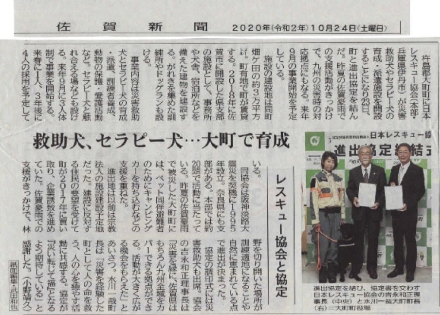 日本レスキュー協会は佐賀県支部拠点の建設にあたり、土地を探していました。災害支援の中で関わりの出来た大町町に、災害救助犬の育成に適した広大な土地を紹介していただきました。