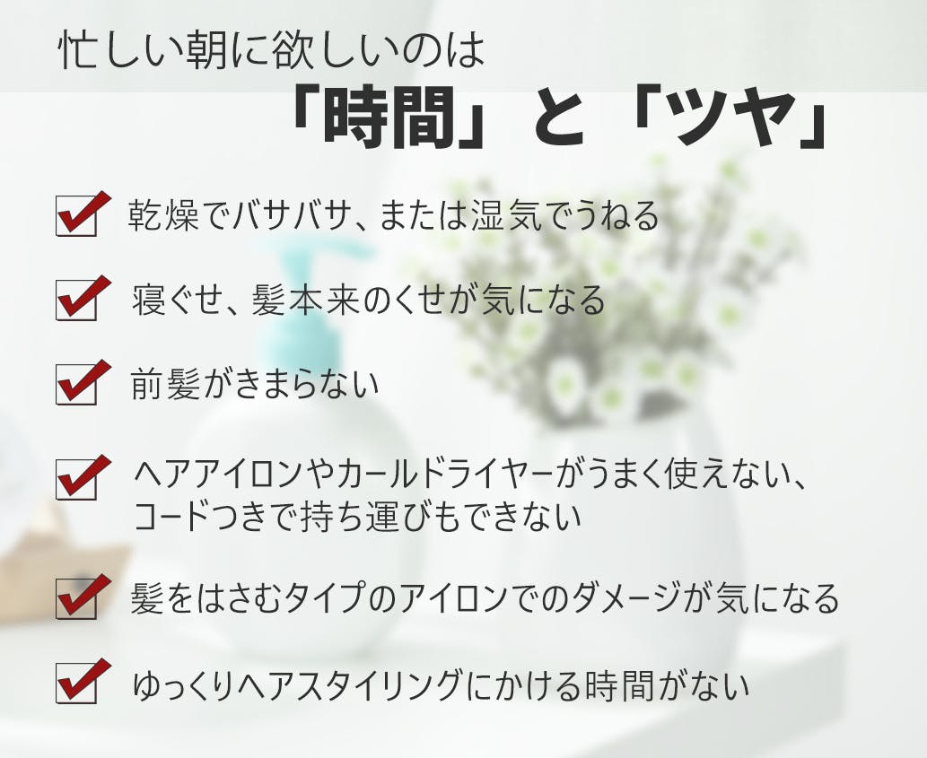 ツヤがありまとまった髪…朝のヘアスタイリングがうまくできると、印象が大きく変わり、気持ちも晴れやかになりますよね。しかし忙しい朝、あれこれお悩みがありませんか??