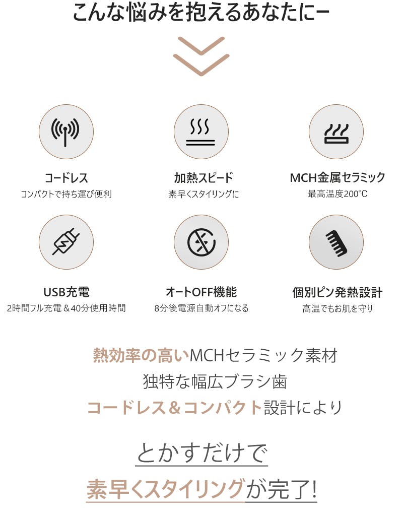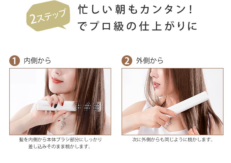 素早く加熱できるMCH(金属セラミックヒーター)素材をブラシ内に配置しており、電源を入れて2分以内に165℃まで温度が上昇。とかすだけで簡単に色々なスタイリングが可能です。