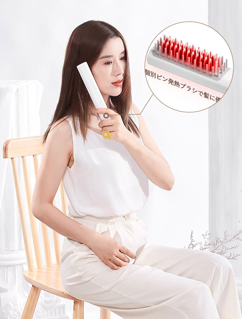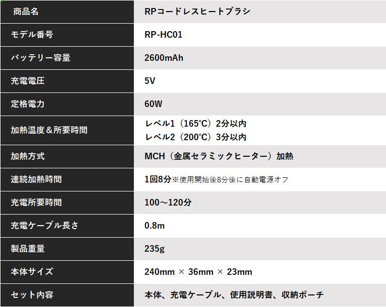 RPコードレスヒートブラシは挟んだり引っ張る必要がないので髪にやさしく、とかすだけでナチャラルなスタイリングに!忙しい朝や外出先でも毎日気軽に使える身だしなみの味方です。