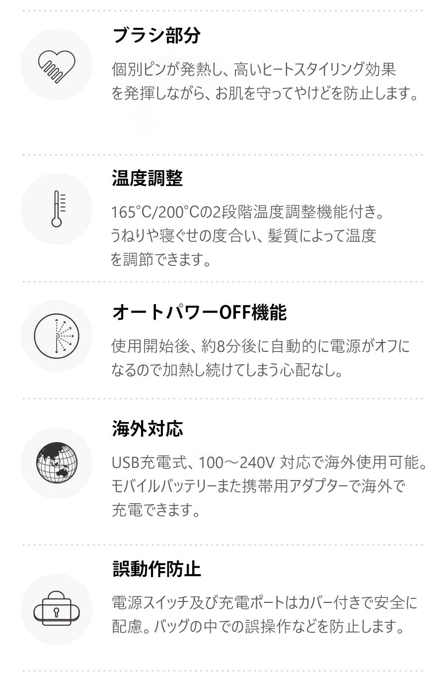 また、165℃/200℃の2段階温度調整機能付き。うねりや寝ぐせの度合い、髪質やどのくらいストレートにしたいかによって温度を調節できます。