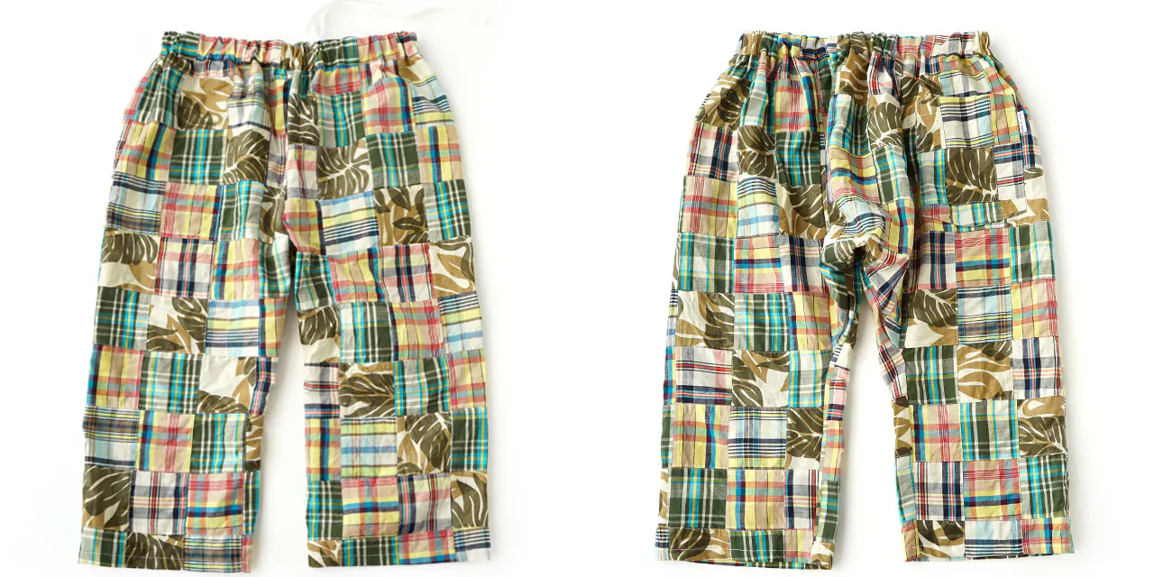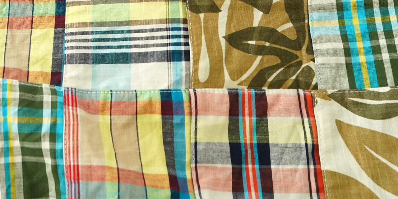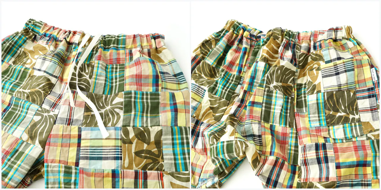 マドラス調のチェック柄数種類とプリント柄とのパッチワーク生地。「パッチワーク風プリント」ではなく、生地を縫い合わせてのクラフト感あふれるパッチワークです。