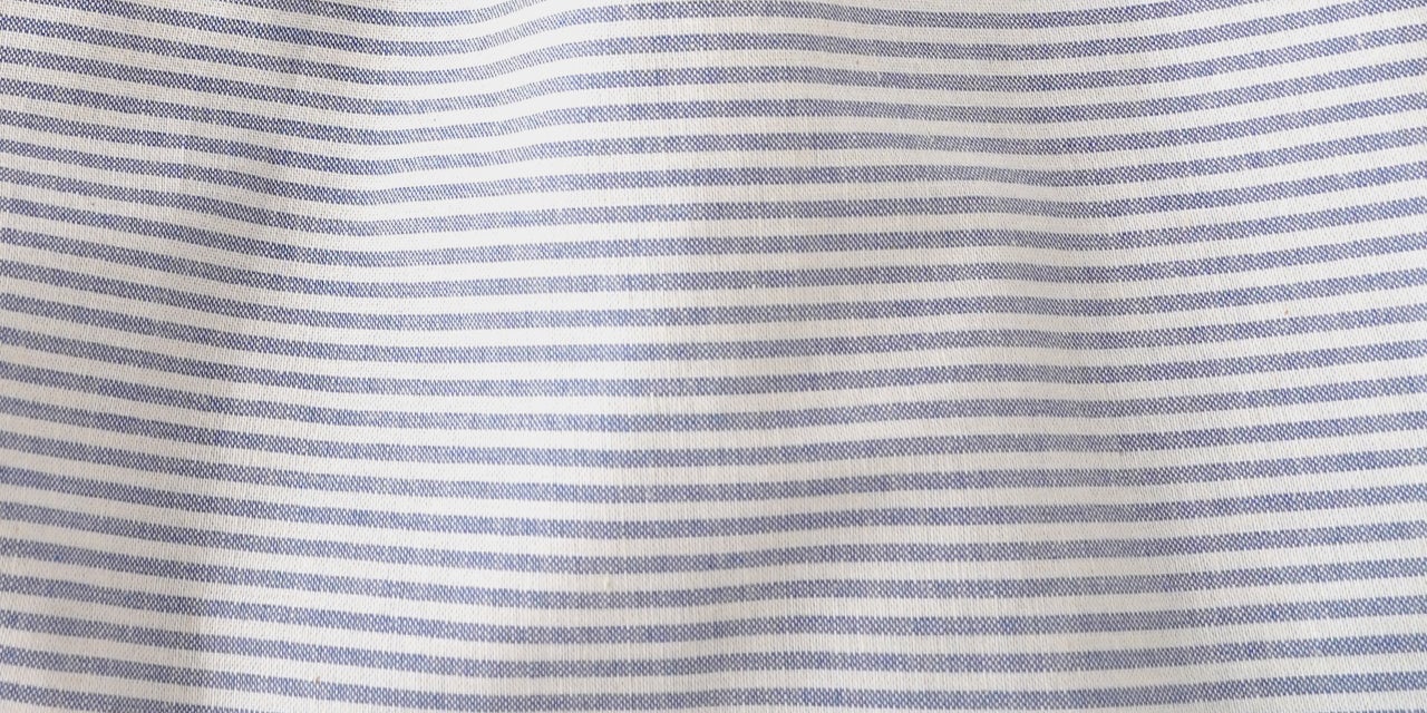 サックスブルーのストライプ柄を横使いにしてボーダーにしました。生地感はオックスフォードシャツぐらいの少しだけ甘めの打ち込みになっています。