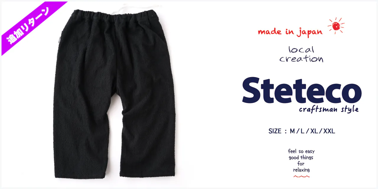 前回のプロジェクトでも好評だったタオル生地のステテコ、新たにブラックカラーの登場です。生地は、日本のタオル生産地のひとつである大阪 泉州産です。タオルのパイルが心地良い穿き心地で一度穿いたらきっと病みつきになるでしょう。