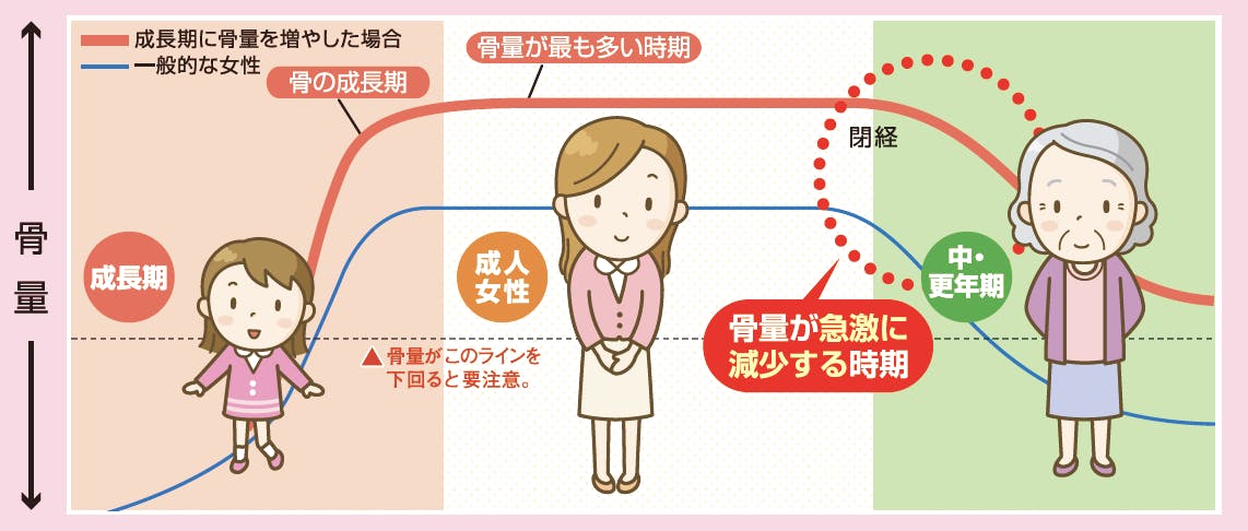 女性は閉経によるホルモンの低下で50歳前後から骨密度が急激に減少してしまいます。それに備えるために十分な骨量をキープする“カルシウム貯金”が重要なのです。