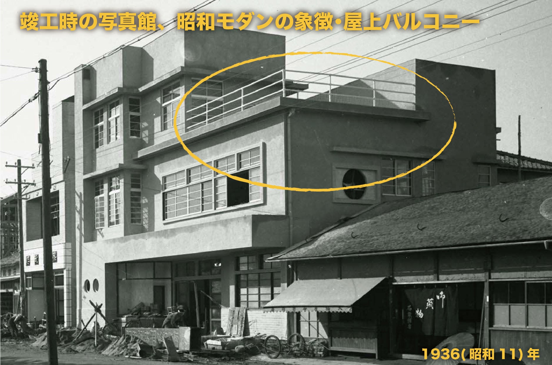 この写真館が竣工した昭和11年当時、屋上バルコニーは大変珍しいものでした。当時、屋上や楼閣造りが、日本中で流行しており、高台を作り花火見物などで人集めをし、賑わいを作ろうとしていたのです。皆高いところが好きですから。(レベルは違いますが、浅草凌雲閣、東京スカイツリーなども同じ発想かと思われます。)復元した昭和モダンの雰囲気漂う屋上バルコニーで、花火見物、トークショー、焙煎珈琲茶会、映像上映会などのイベントを企画しようと考えています。