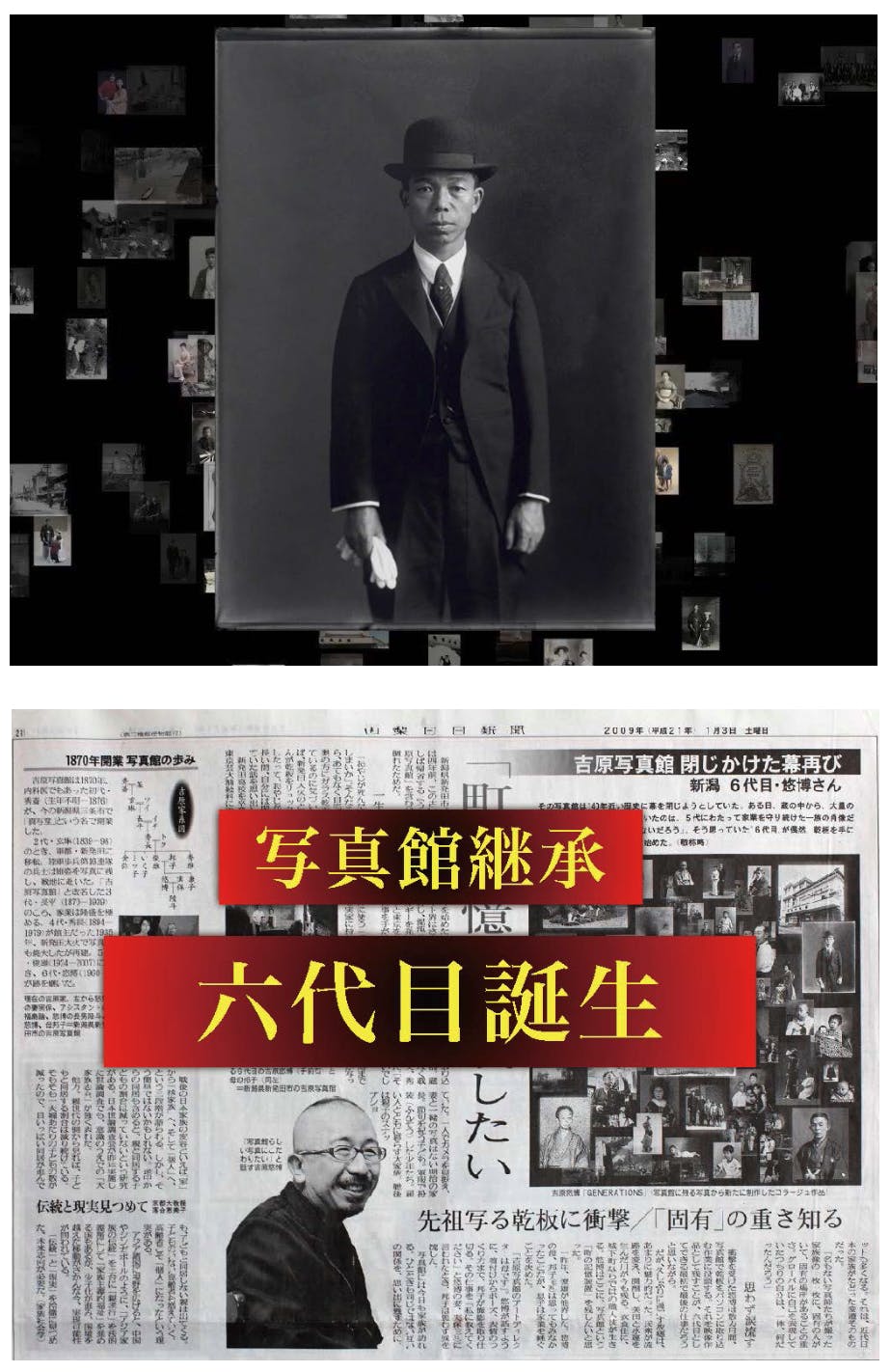 2003年、正月に帰省した時、土蔵の中をじっくりと観察して回りました。今の状況では私が長男で後継者、土蔵の後片付けも私の仕事になるだろうと考えたからです。とりとめなく物色していると、調度品の間にある大量の写真が目に留まりました。土蔵の中はとても寒かったのですが、惹きつけられるように見入りました。写真の人物の存在感が、胸に迫ってきからです。 全て親族だと考えて呆然としました。これらの写真が破棄されるのを想像して、ゾッとしました。写真の祖父が、寂しそうに私を見つめているように感じました。「自分の家族の歴史を捨てるつもりなのか? それが、お前の目指す「アート」なのか?」と語りかけているようでした。自分の中ですが、祖父の言葉は、かなり響き、正直参りました。その後、さらに様々な経緯があったのですが、結局、地元・新発田に戻り、写真館を継ぐことに決めたのです。それが、美術家の仕事であると心から感じたからです。写真を撮影すること、表現すること、残す意義の事を真剣に考え始めたのは、このころからです。