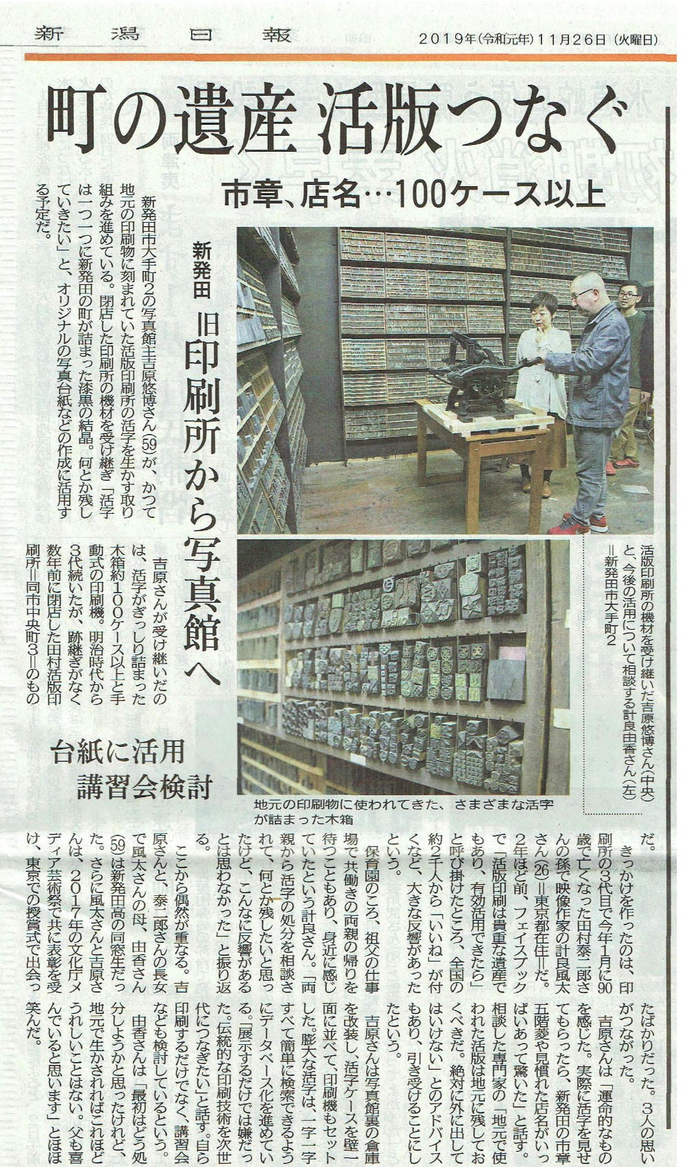 私の祖父は新発田で活版印刷業を営んでおりました。祖父が亡くなり大量の活字を誰かに譲るのか、処分するのか親族で悩んでいた中、吉原さんにお声がけいただき、活字一式を引き取っていただくことになりました。親交があった吉原さんに祖父の活字を再活用していただけること、そして祖父の活字が新発田に在り続けること、私はこれらのことを喜ばしく思っております。 吉原写真館は新発田の歴史を繋ぐ場所です。私の祖父の歴史も在るこの場所は、いつまでも新発田に在り続けてほしいと思っております。