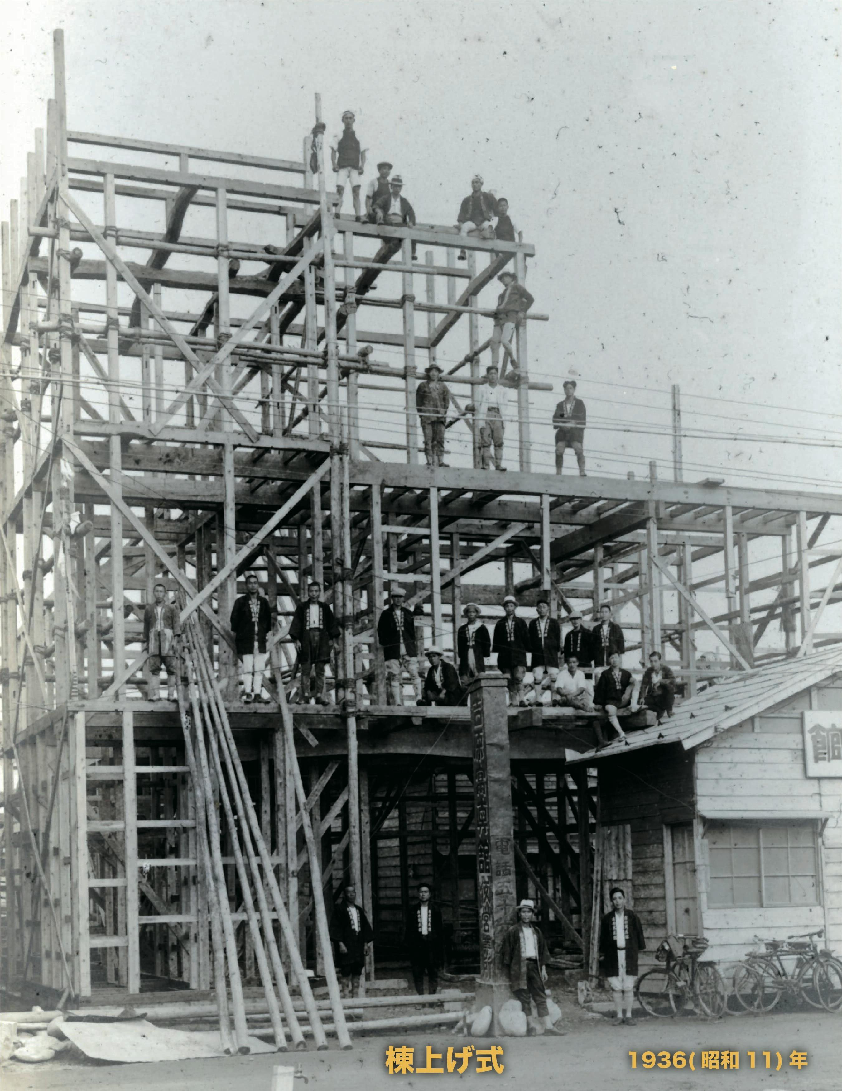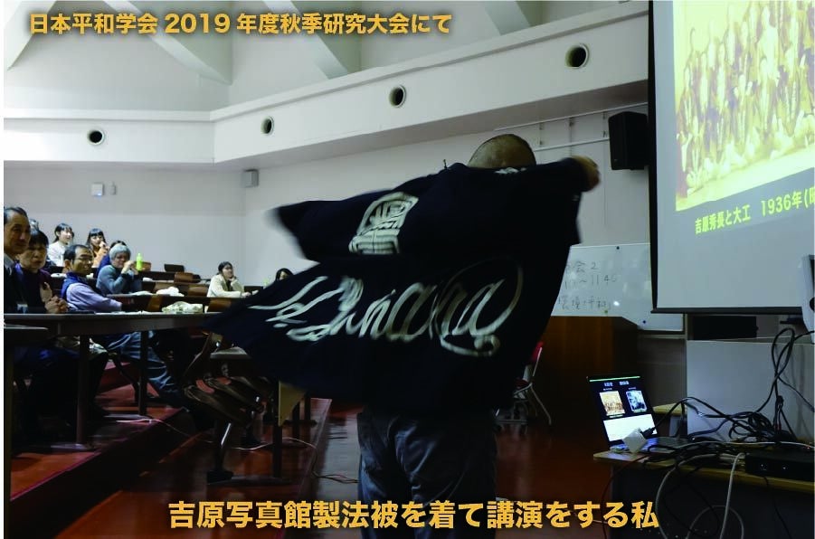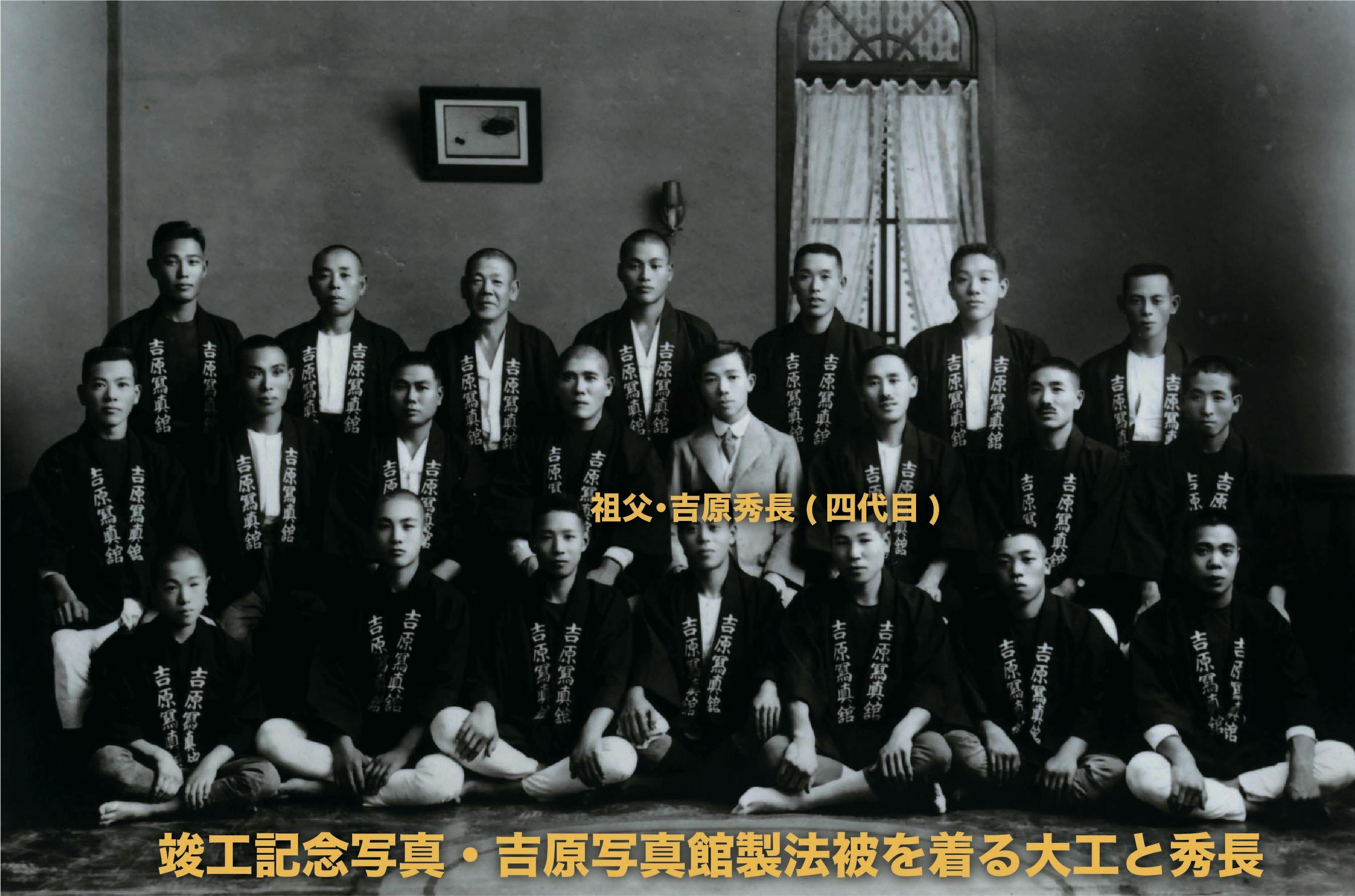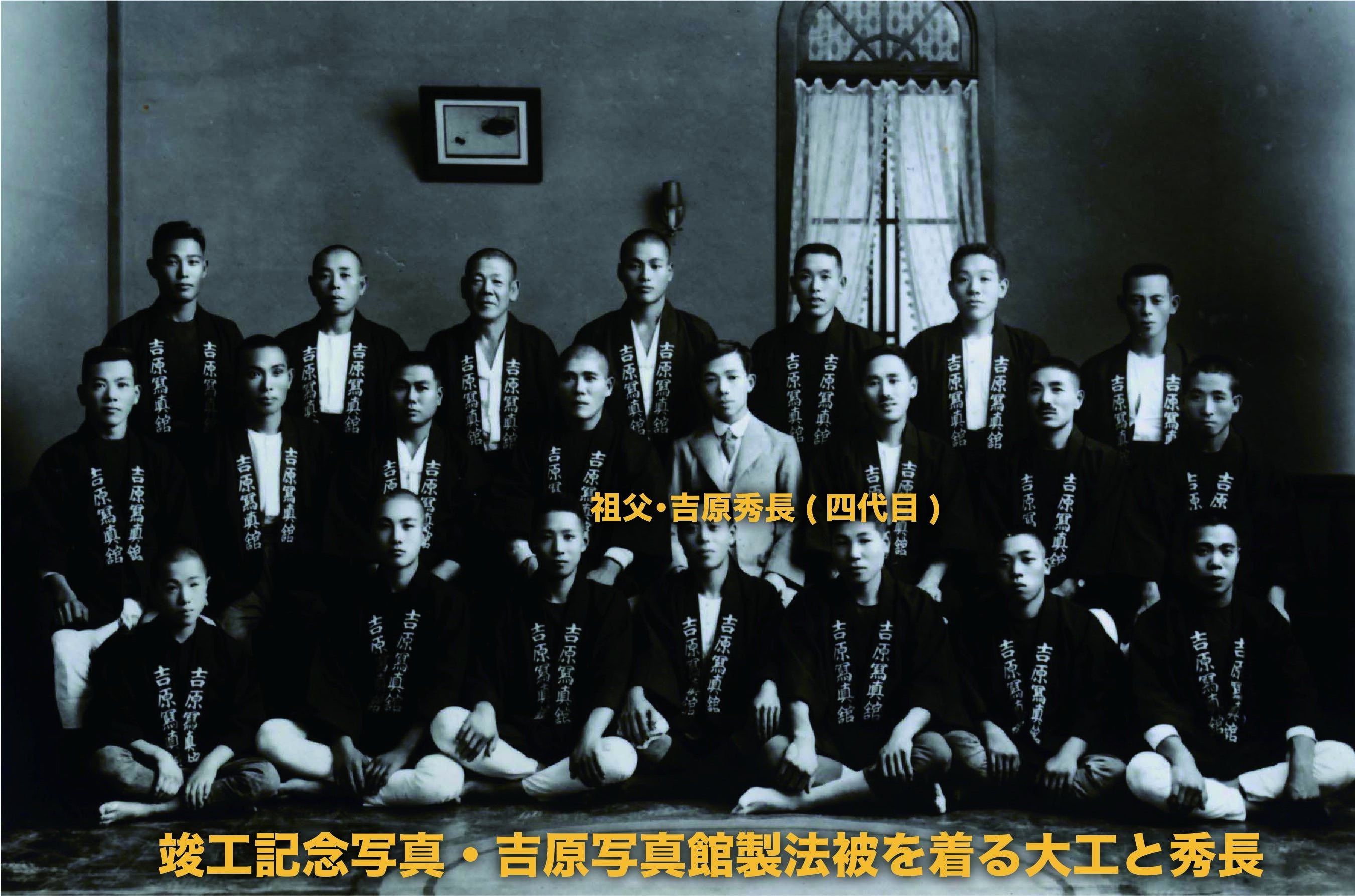 最初の写真は、旧吉原写真館の写真です。現在と全く同じ場所にありましたが、1935(昭和10)年に新発田大火で全焼しました。その翌年1936(昭和11)年、祖父・秀長が、再建。それが現在の写真館です。現在で、築85年になります。建築中の写真も多数残っております。当時の建築は、まるで祭りのようだったのでしょう。吉原写真館という法被を着ていることから想像できます。もう1枚の写真は、竣工後の記念写真。真ん中にいるのが、私の祖父・秀長です。この法被、現在でも、5点ほど残っております。そして、祖父の着る法被は特別仕様で、ローマ字でH.Yoshiharaと染め抜きしてあります。最近、講演会の時、この祖父の法被を着ることにしています。