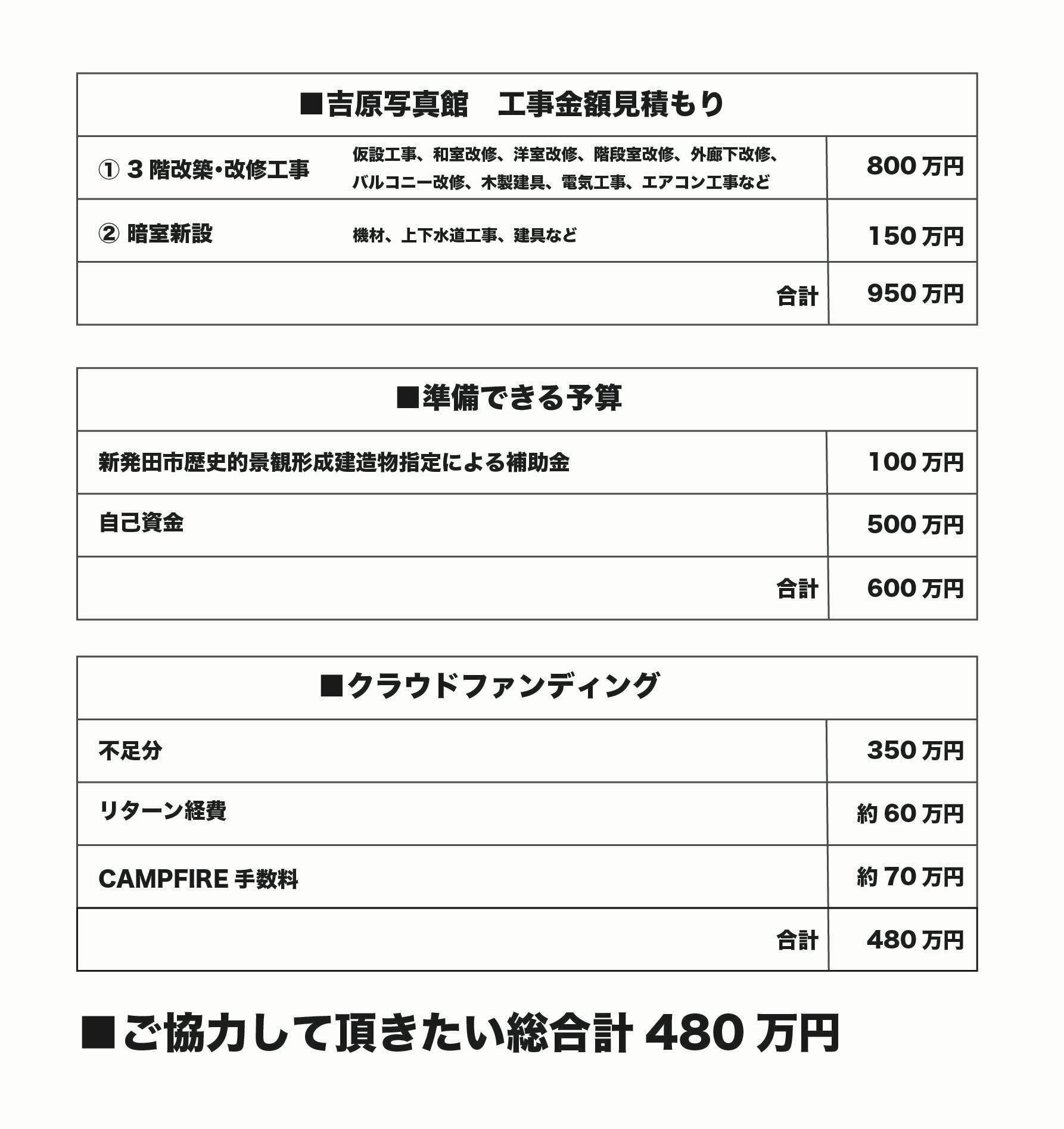 添付概算概算見積もりは、3階改築(ルーフバルコニーとギャラリー)と暗室新設に費用です。合計950万円。準備できるお金が600万円、350万円不足です。リターンにかかる経費が約60万円、CAMPFIREの手数料(17%)が、約70万円。480万円を、なんとか集めなければなりません。