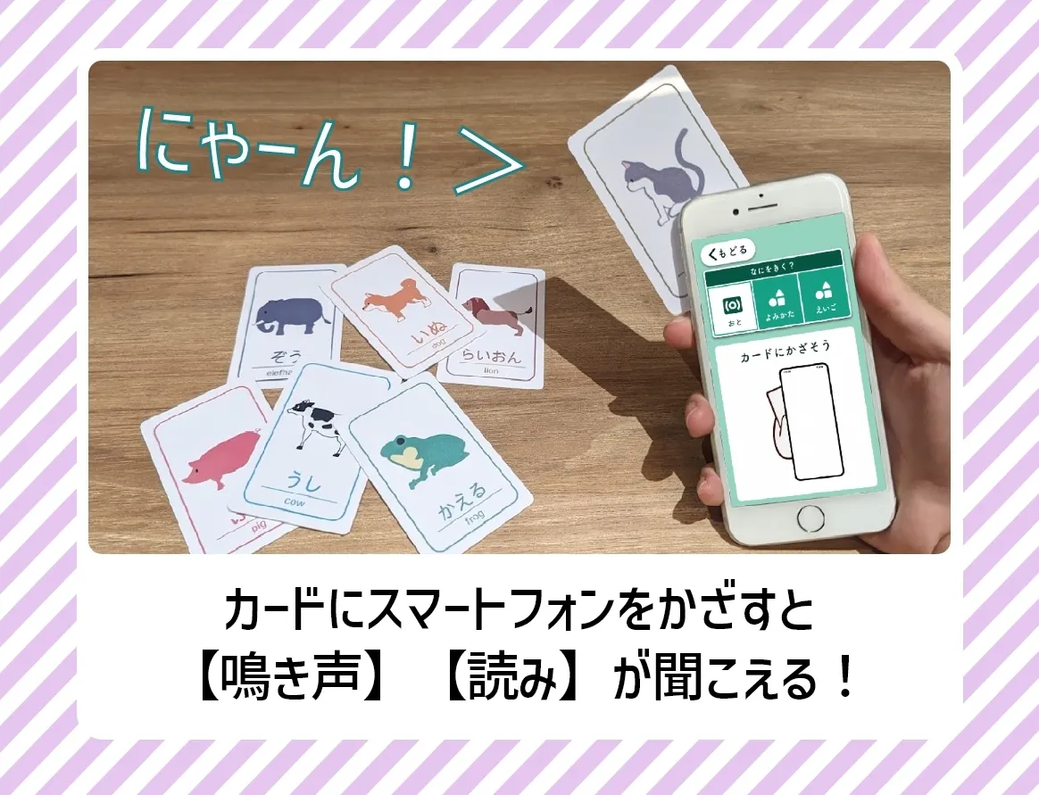 カードにスマートフォンをかざすと音が出る。直感的だけれども「面白い」動作によって、楽しくカードで遊ぶことができます。