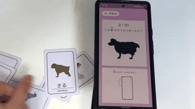ほかにも、シルエットからなんの動物のカードか当ててみるモードや、日本語・英語から探すモードなど、遊び方は無限大!