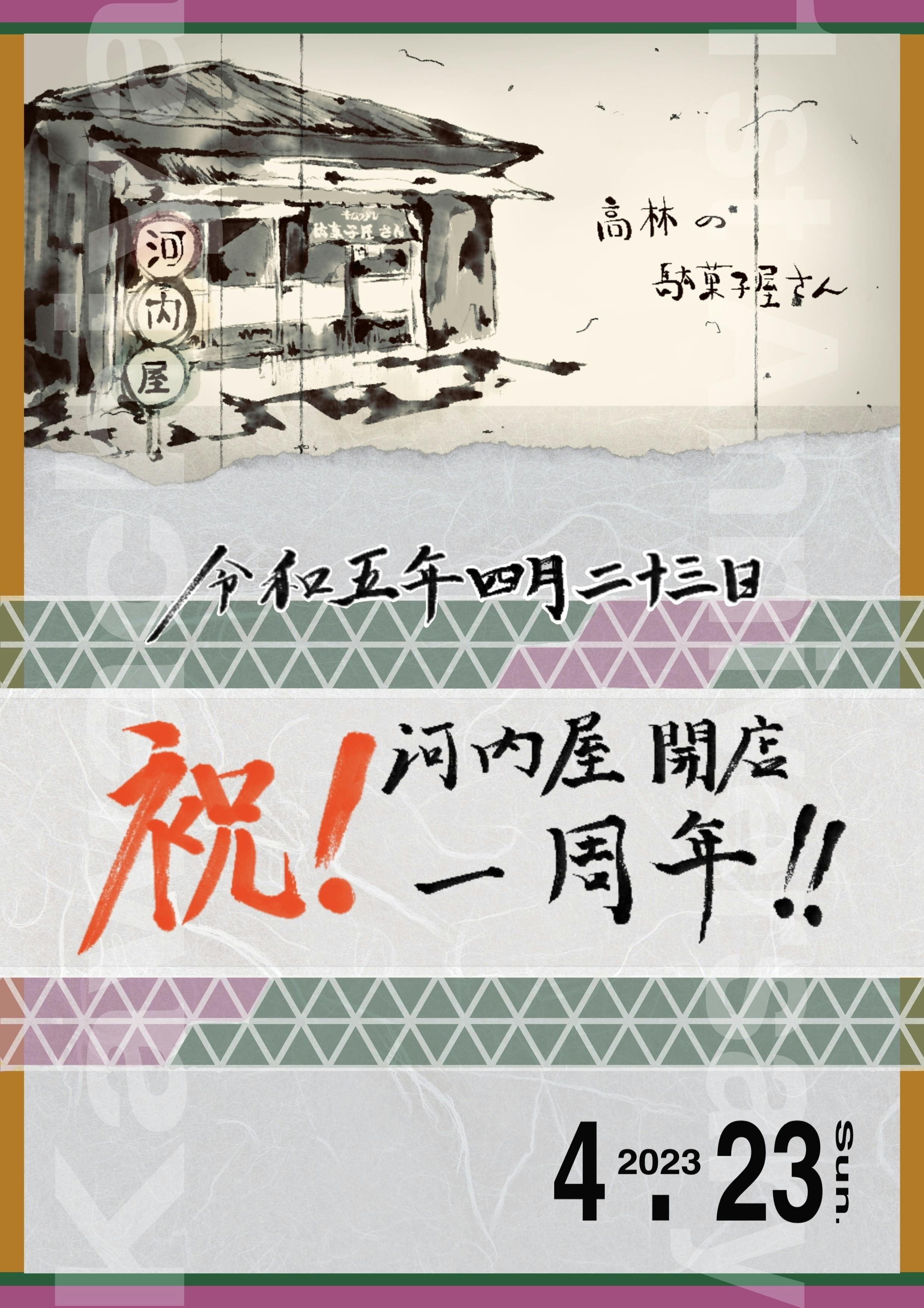 • 当日の報告となり申し訳ありません。おかげさまで、本日河内屋は開店一周年を迎えます。そこで、河内屋店内に掲示してある紙にお祝いのメッセージを書いてくださった方にはちょっとしたお菓子をプレゼントします。また、14時ごろから河内屋の王様が来店します。当プロジェクトの王様プランにて支援をしてくださった方です。今日は天気もよく絶好のお出かけ日和になりそうです。ぜひ、みなさまお越しください。 もっと見る