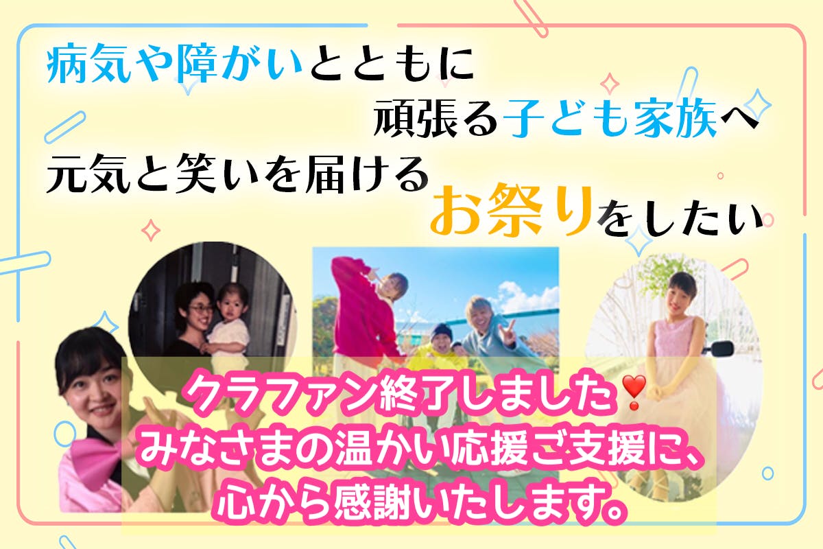 2022/06/21 09:35病気や障がいとともに頑張る子供・ご家族へのお祭を開催し、元気と笑いを届けたい!!!はっぴーす!隊初めてのクラウドファンディングが、終了致しました。124名ものたくさんの方達からの本当に温かいご支援に心から感謝いたします。ご支援いただきましたリターンのご連絡や、グッズ発送等順次致しますのでもうしばらくお待ちくださいませ。病気や障がいとともに頑張る子供やご家族に、クスッと笑ってもらったり、いま笑うような気分ではなくてもあとから思い出し笑いできる時間になるような、元気や笑いを、届けていきます!!!温かい皆さまの、たくさんの「想い」をのせて。はっぴーす!祭2022で当日や、動画で皆さんとお会いできること、はっぴーす!隊一同とても楽しみにしております。はっぴーす!隊の「輪」が、これからも、広がっていきますように。心から、感謝を込めて。今後も、はっぴーす!隊の活動を応援していただけますと、幸いです!!!!!はっぴーす!病気や障がいとともに頑張る子どもたちへユニークな人や体験を届ける活動はっぴーす!隊 隊長 志賀 あさ美 もっと見る終了まで、残り1時間です!!!