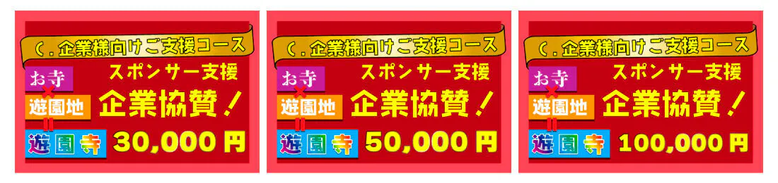 100,000円・・・会場内掲示板の「上段先頭」に「一番大きな文字で」お名前が載ります。また、エア遊具の前に独立した「〇〇〇社様提供」の立札を掲示します。