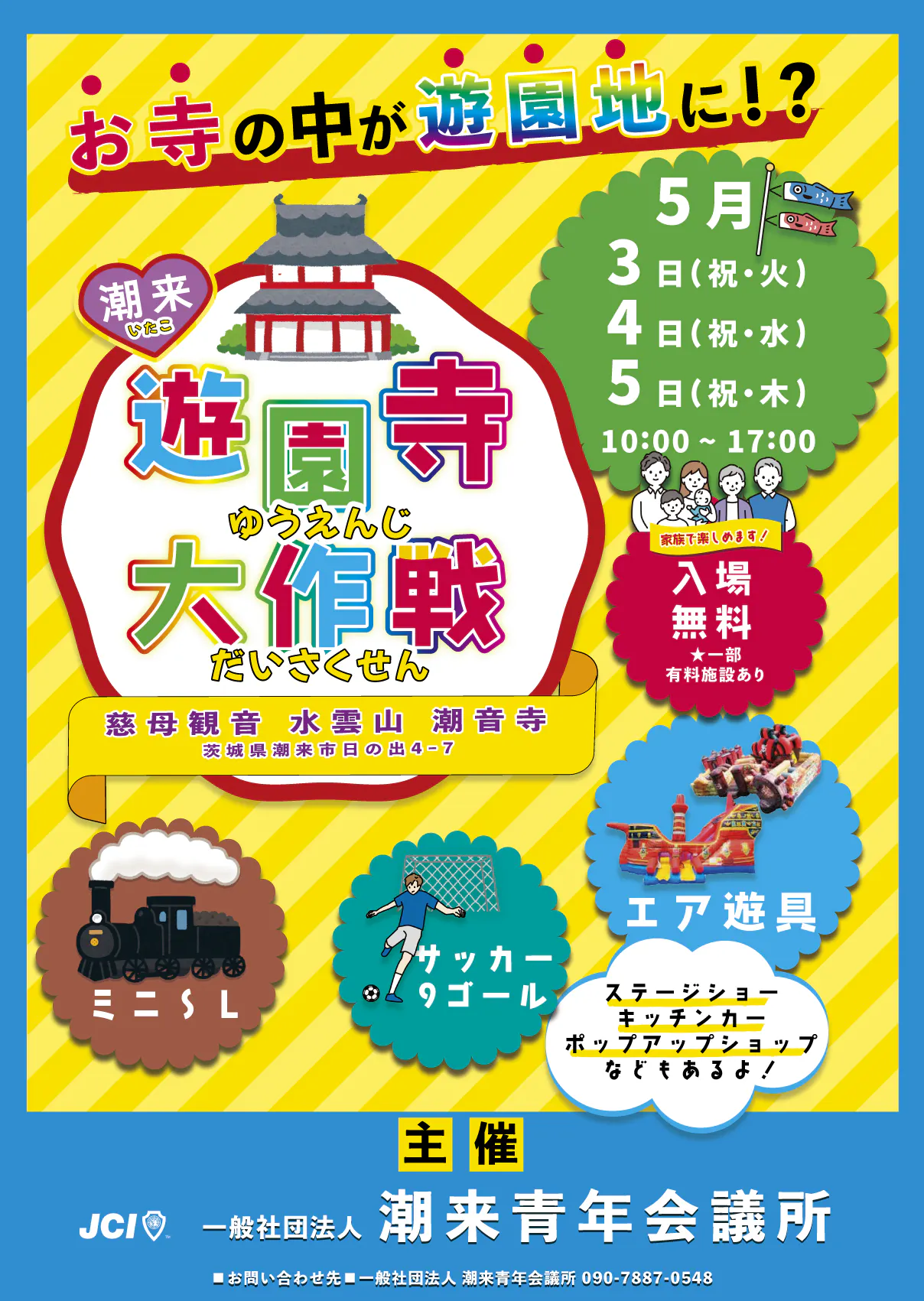 2022/05/03 07:00【いよいよ本日開催】ついに!!!【いたこ遊園寺大作戦】が開催!!!!お待たせいたしました!様々な企画を用意しております!ゴールデンウィークはぜひ、遊園寺を通して、茨城県潮来市で遊びましょう!!!潮来にはいいところ、美味しいものたくさんありますよ〜!!「子供に夢を、街にはつながりと活気を。」このイベントは、少子化による人口減少になやむ、とある地方の青年団体が挑戦する新しいまちづくりです!万が一道が分からない!となった方は、潮音寺(0299-66-0623)までお電話を!皆さまのお越しを心よりお待ちしております!潮来青年会議所+゚☆゚+。+゚☆゚+。+゚☆゚+5月3.4.5日は、茨城、潮来に行こう!いたこ【遊園寺(ゆうえんじ)】大作戦をゴールデンウィークに開催します!【静かなお寺が遊園地に⁉︎】★開催日時★2022年5月3・4・5日(火・水・木、いずれも祝日)各日程10:00~17:00※会場となる潮音寺は8時から参拝が可能。★開催場所★慈母観音 水雲山潮音寺にて(茨城県潮来市日の出4-7)★入場料金★無料(一部有料施設あり)お寺と遊園地の融合=「遊園寺」プロジェクト!親子や若者に夢の遊び場を作りたい!!↓サイトはこちら↓https://camp-fire.jp/projects/view/573400【潮来 遊園寺】で検索!イベント開催にあたり、想いが上記サイトにて公開中です!一般社団法人潮来青年会議所+゚☆゚+。+゚☆゚+。+゚☆゚+ もっと見る
