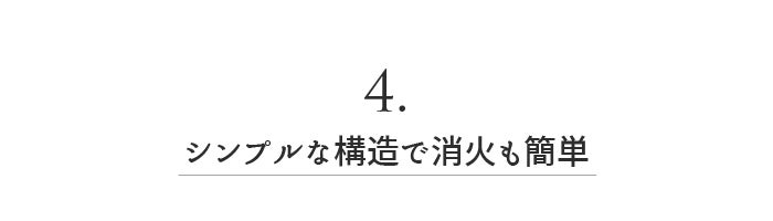 【TOMOSHIBI】は、燃料槽と本体からなるシンプルな構造のため、消火も1ステップと非常に簡単です。また分離構造をとるために本体が熱くなりにくく、さらに燃料は燃焼時間を管理しやすく消し忘れの心配もありません。