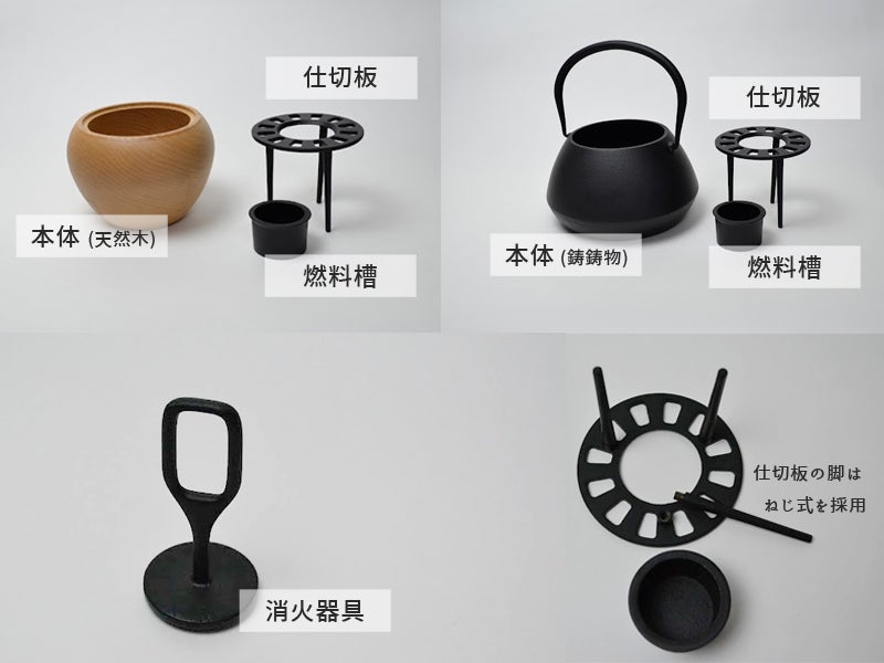 【TOMOSHIBI】には、『HIBACHI』と『TETSUBIN』という選べるふたつのデザインをご用意しました。それぞれ「火」にまつわるストーリー性を持たせたデザインです。