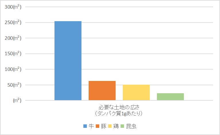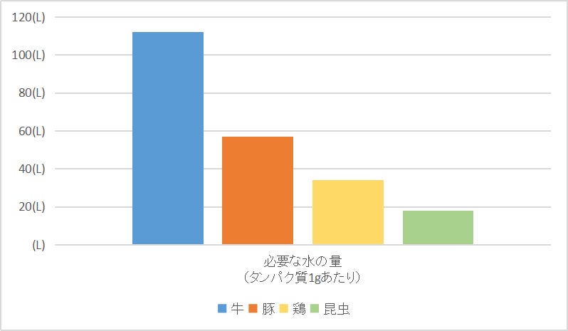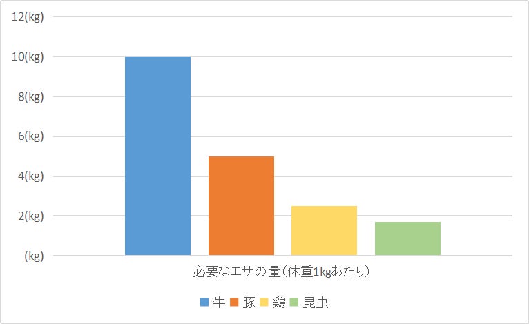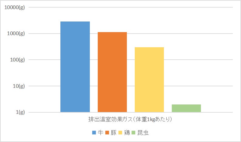 生産時の昆虫の温室効果ガス発生量は、以下のグラフが示す通り家畜と比べてかなり少なく、地球にとてもやさしいのです。必要なエサや水の量も牛・豚・鶏と比べはるかに少量で、狭い土地の中で飼育することができます。家畜を昆虫生産に置き換えると相当のCO2排出量を減らすことができ地球温暖化防止に貢献することができます。