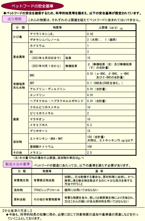 (※1)ドッグフードを輸入販売するには農林水産省が定める成分の安全基準を満たすことが義務づけられています。そのため新商品を販売する際には毎度、ドッグフードの成分分析を専門分析機関にて行い、全て農林水産省が指定する以下「ペットフードの安全基準」の基準値を満たす必要があります。