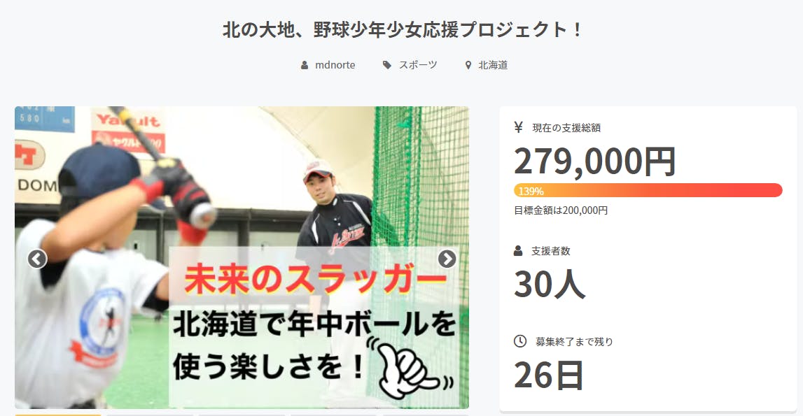 2022/04/20 08:46もう1校、新スクール開校を目指して!開始から48時間が経過したとろで、早くも目標金額の20万円に到達する事が出来ました。ご支援いただきました皆様、本当にありがとうございます。子どもたちの夢の実現にご理解をいただき、ご支援いただきました事が目標金額達成に繋がったと感謝いたしております。また、西宮の沢校、山の手校共に無料体験会に多数のお子様たちのご参加をいただき、告知・拡散にご協力をいただきました皆様、誠にありがとうございます。西宮の沢校は4/12、山の手校は4/14に無事開校致しております。皆様の反響にお応えすべく、更なる目標を設定したいと考えました。目標金額は60万円です。ネクストゴールが達成いたしましたら、もう1校のスクール開校をし、現在話題に上るボールパーク建設中の北海道北広島市に新たにスクールを開校いたします。さらに、ネクストゴール設定に際し、リターンにはマンツーマンレッスンなど、新たなリターンを加えました。ご期待にお応えできるよう、また絶対に子どもたちの夢の実現に向けた環境を整備出来るよう、より一層努力してまいります。皆様のより一層の告知・拡散をよろしくお願いいたします。 もっと見る