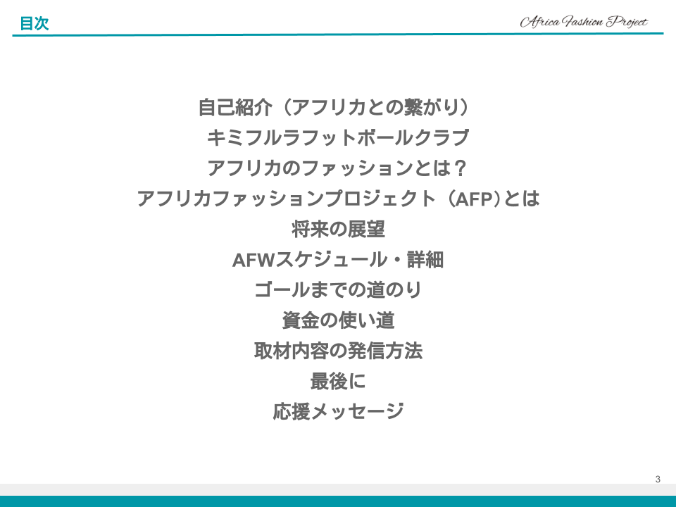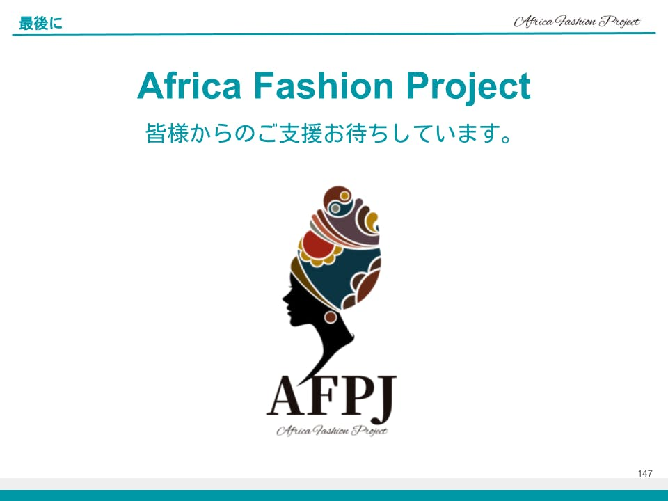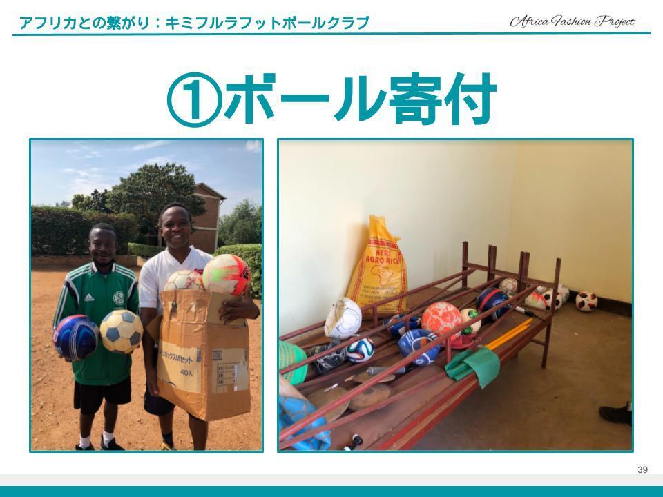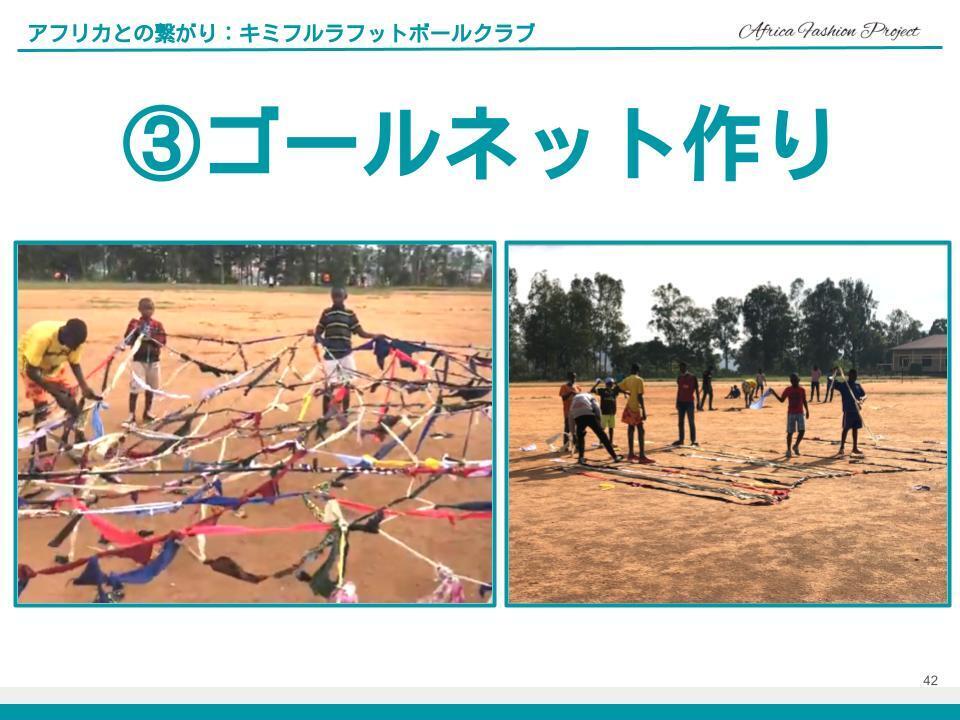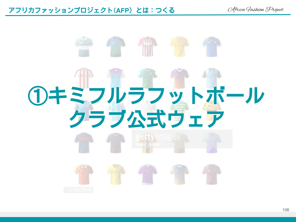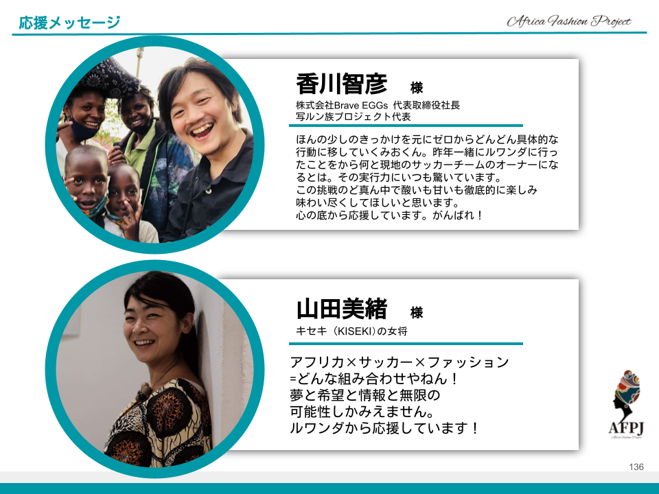 この4か国のAFWに参加することで繋がったアフリカファッション関係者、それから世界のファッション関係者と共にこのプロジェクトを進めることができれば、キミフルラフットボールクラブの子ども達だけではなく世界のサッカー少年にもなると信じております。