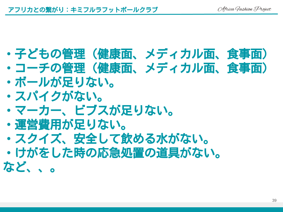 この大量の問題を前に、何とかして子ども達の為にこの大量の問題を解決したい!!『サッカー選手になりたい』という子ども達の夢を叶えたい。応援したい。と改めて感じました。