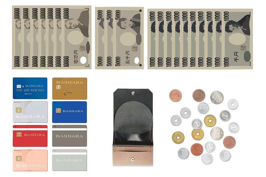 カード8枚、小銭20枚、紙幣20枚で、厚さは約2cm